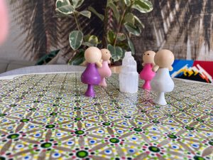Terug aan tafel hebben we de opstelling gestopt en de poppetjes waren weer poppetjes en mocht ze zichzelf, de godin en wat haar naam betekent, “Boodschapper van God” plaatsen. Met deze delen verbind ze zich volledig. Dit geeft energie en word ze BLIJ van. Ze heeft er een foto van gemaakt zodat ze deze opstelling nog in haar huiskamer kan plaatsen.